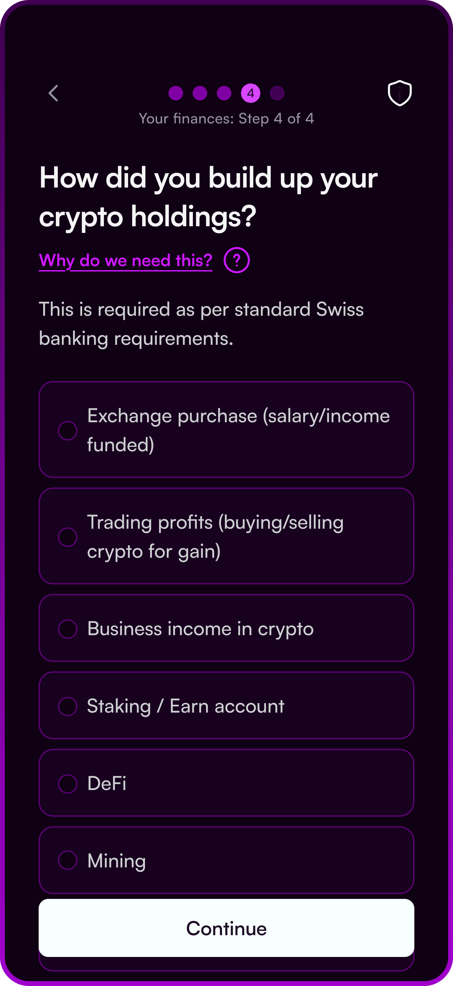 A contextual question about how they acquired crypto allowed the system to adjust documentation requirements accordingly.